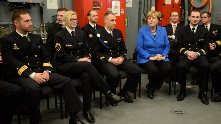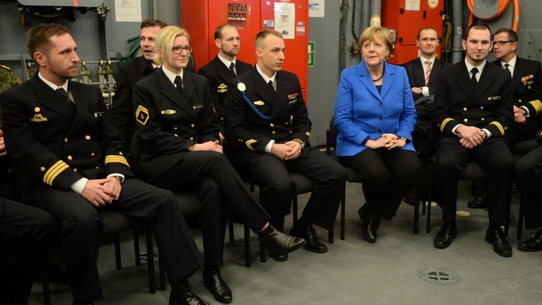 Bei ihrem ersten Besuch des Kieler Marinestützpunkts kommt die Kanzlerin auch mit den Soldaten ins Gespräch.