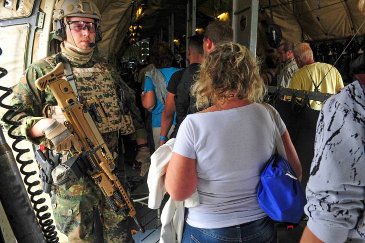 Geordnet suchen die zu evakuierenden Personen ihre Sitzplätze in der Transportmaschine.